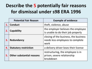 Explain the differences between fair and unfair dismissals. Unfair dismissal law is based on the principle that employees have a right to fair treatment. Employment Rights Act of 1996 states the following fair reasons for dismissal.
